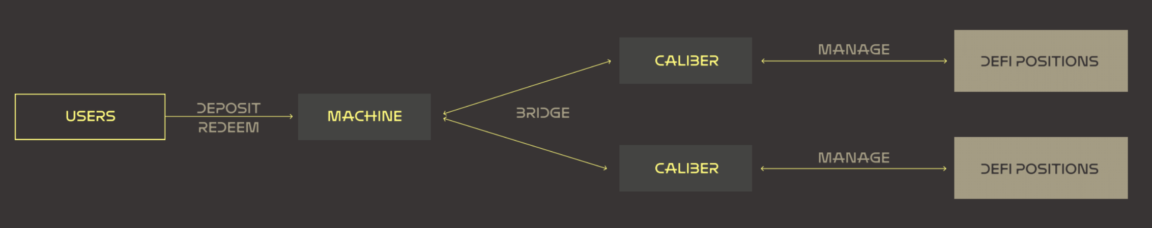 Makina's fundamentally different architecture represents a new approach for vault operations. At its core lies the hub-and-spoke model of a Machine deployed on Ethereum Mainnet as the hub, interacting with Calibers serving as execution environments on Layer 2 chains (figure 2). This design enables transparent unified strategy management across multiple networks, quick deployments on new chains, all without sacrificing security benefits of non-custodial operations.