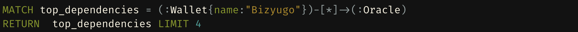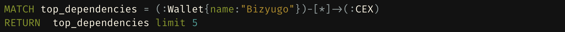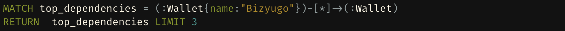 The query identifies the newly introduced wallet node ("Bizyugo") and initiates a Breadth-First Search (BFS), traversing all possible directed edges originating from the wallet. This process maps the entire network of dependencies, providing a comprehensive view of how the wallet is interconnected with other entities within the graph.