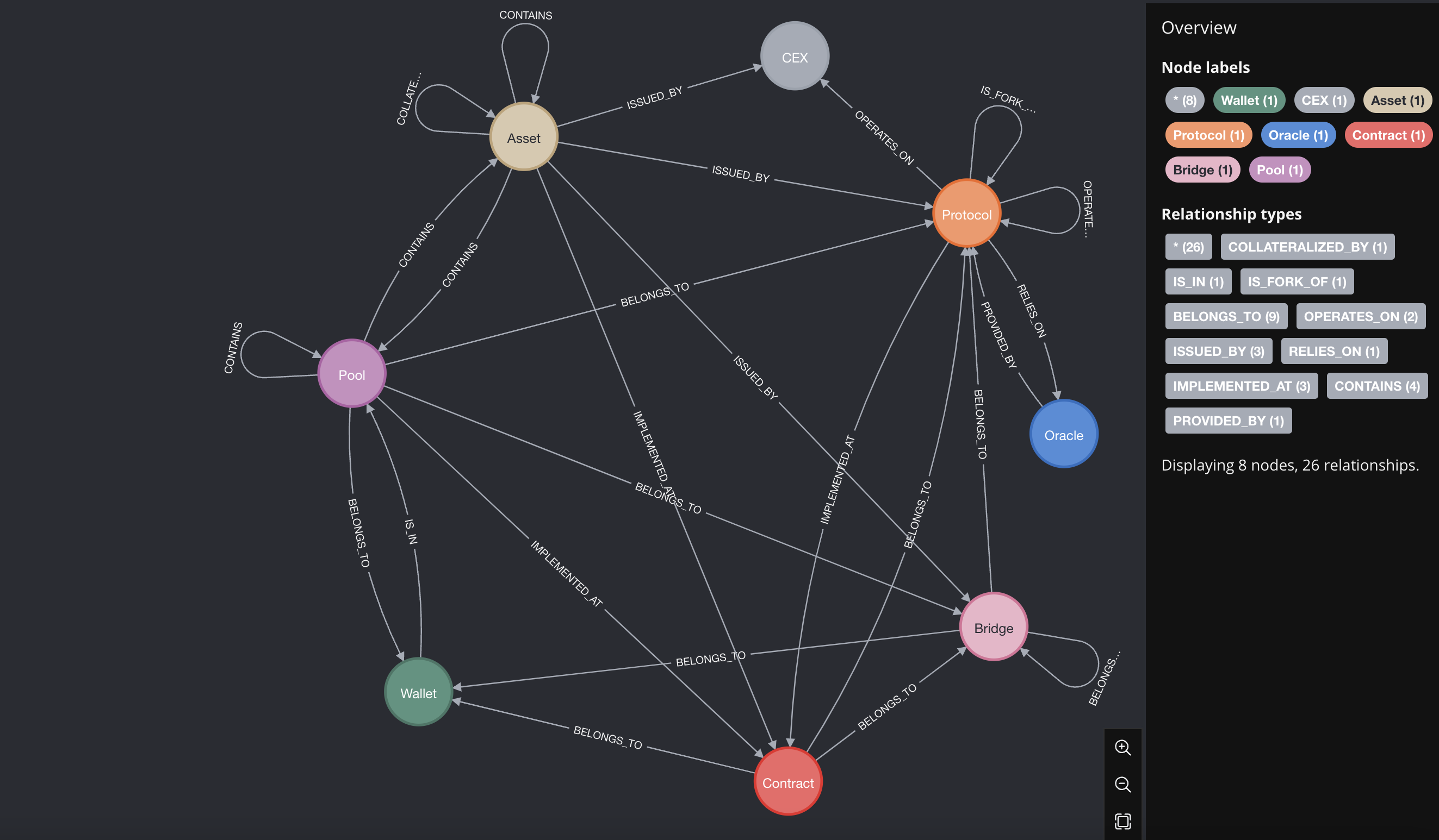 • Added Contract nodes representing Asset and Pool implementations, to which they are connected through the IMPLEMENTED_AT relationship.