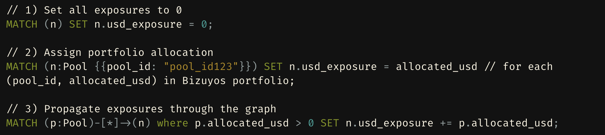 We integrate the subject's wallet into the Nebula graph as a node, linking it to each of its positions (Pool nodes) via an 'IS_IN' relationship. Leveraging the graph's pool-centric architecture, we can efficiently map all the wallet's dependencies by executing the following Cypher query.